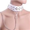 Изготовлен из натуральной кожи с велюровой подкладой. При изготовлении использована никелированная фурнитура. Размер универсальный. Ширина - 4,5 см. Длина цепочки (поводка) с карабином - 50 см.