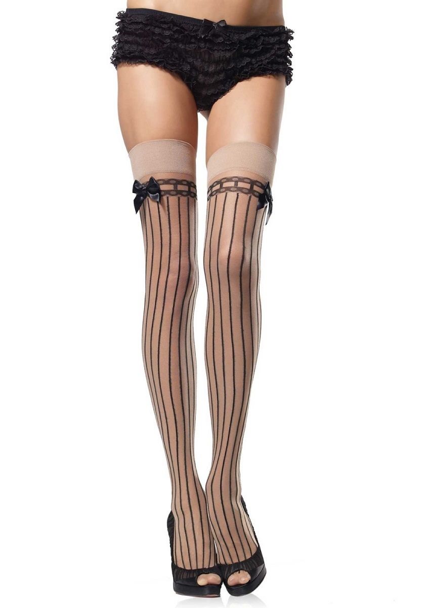 Прозрачные чулки сплошной фактуры с продольными полосками и атласными бантиками.