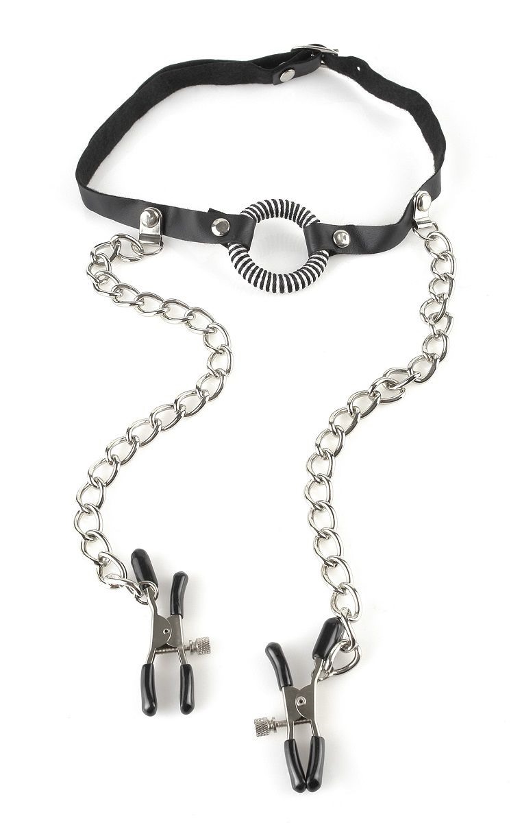 Кляп с зажимами для сосков на теле выглядит очень интригующе и возбуждающе. Кляп представляет собой небольшое металлическое кольцо, обтянутое кожей, которое надевается с помощью регулируемых кожаных ремешков. Он играет роль расширителя для рта: оставляет рот открытым и при этом не позволяет ему закрываться – настоящее искушение. Зажимы для сосков имеют специальное резиновое покрытие и винтики, позволяющие регулировать степень давления. Кляп соединяется с зажимами с помощью двух металлических цепочек, которые натягиваются при повороте головы и усиливают ощущения. Открытый бюстгалтер бра, изображенный на коробке, не входит в комплект! Диаметр кольца - 4,5 см.