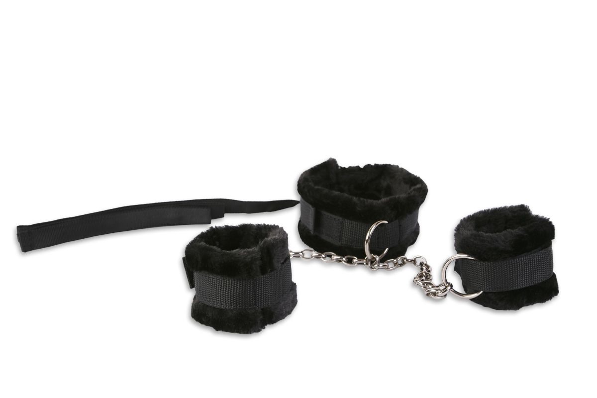 Отличный комплект для тех, кто хочет почувствовать себя Рабом, при этом сохранить максимальный комфорт. Наручники, ошейник и поводок – это то, что нужно для эффектного начала! Все элементы комплекта изготовлены из мягкого и приятного на ощупь нейлона. С внутренней стороны они отделаны искусственным мехом, который сохраняет комфорт. Ошейник и манжеты соединены цепочкой, которая ограничивает движения партнера. Поводок съемный. Длина ошейника - 44 см. Длина наручников - 40 см.