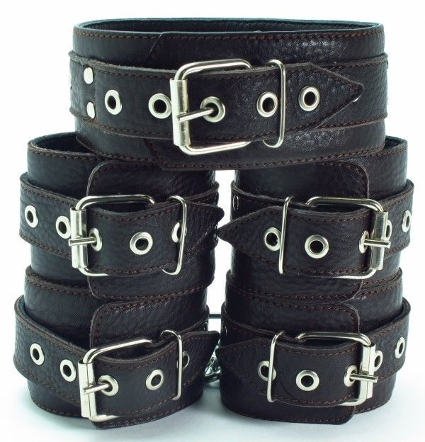 Набор аксессуаров коричневого цвета, изготовленных из натуральной кожи. В него входят: наручники и наножники, украшенные заклепками, которые можно соединять и комбинировать между собой при помощи цепей с карабинами (входят в комплект). Размер меняется при помощи застежки. Также имеется ошейник с одним кольцом. Размер регулируется застежками. Все атрибуты имеют внутреннюю меховую подкладку для комфортного использования. Ширина браслетов - 6 см. Ширина ошейника - 5 см. В комплекте: наручники с мехом, наножники и ошейник.