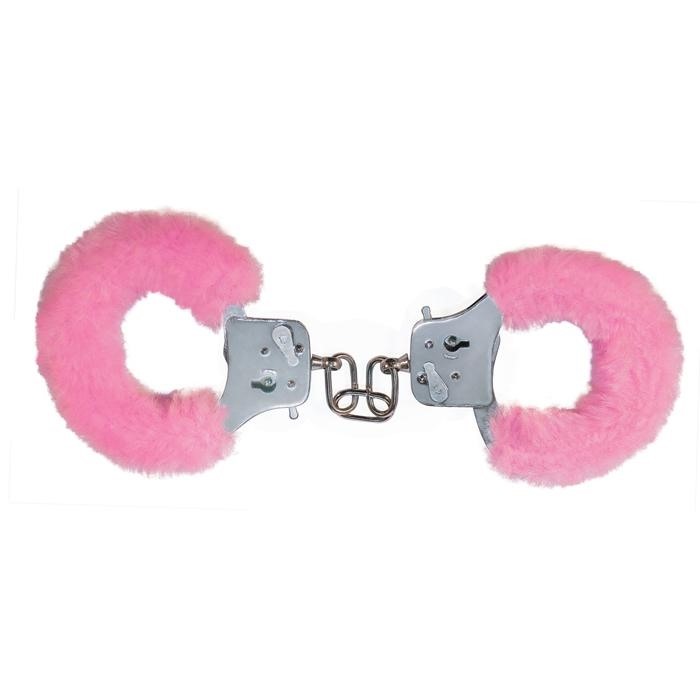 Металлические наручники с искусственным мехом розового цвета. В комплекте имеются ключи для наручников