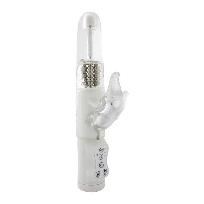 Водонепроницаемый прозрачный вибромассажер с семью режимами вибрации, регулируемые при помощи сенсорных кнопок для более удобного использования. Имеет внутренний вращающийся вал , обеспечивающий более сильное воздействие на чувствительные зоны половых органов. Клиторальный стимулятор выполнен в форме морской звезды. Вибромоторчик расположен в двух элементах изделия. Изготовлен из материала –TPE. Имеет рельефную , гладкую поверхность, очень мягкий , но при этом достаточно упругий. Работает от трех батареек типа ААА ( в комплект не входит). Общая длина изделия 21,5 см, рабочая длина 14,5 см, максимальный диаметр 3 см.