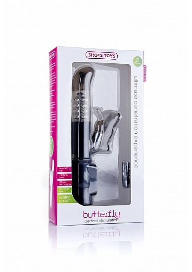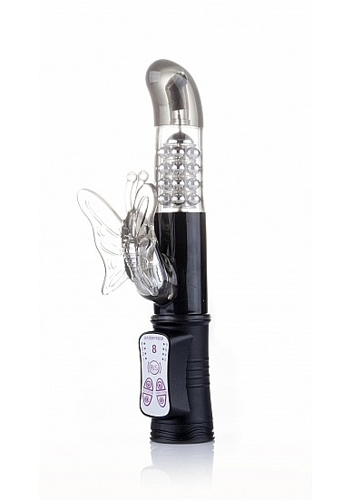 Многоскоростной вибратор черного цвета с режимами вращения ствола и мощным клиторальным стимулятором в виде бабочки. Имеется возможность менять направление вращения (направо-налево). Мягкий, имеет гладкую поверхность. Внутри ствола расположены металлические шарики. Характеристика: водонепроницаемый, материал - ТПЕ, АБС, имеет 8 режимов вибрации, управление производится при помощи кнопок у основания игрушки. Общая длина - 23 см, рабочая длина — 11,5 см, максимальный диаметр - 3 см, длина клиторального отростка - 7 см, диаметр - 6 см. Работает от 4ААА батареек (есть в комплекте). Упаковка: картонная коробка.